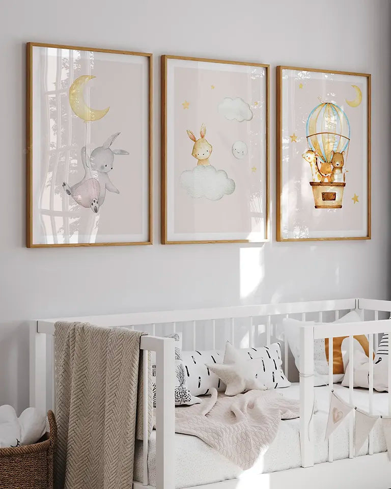 Çocuk odaları için yumuşak tonlarda hazırlanan posterler. Sakin bir atmosfer oluşturur.