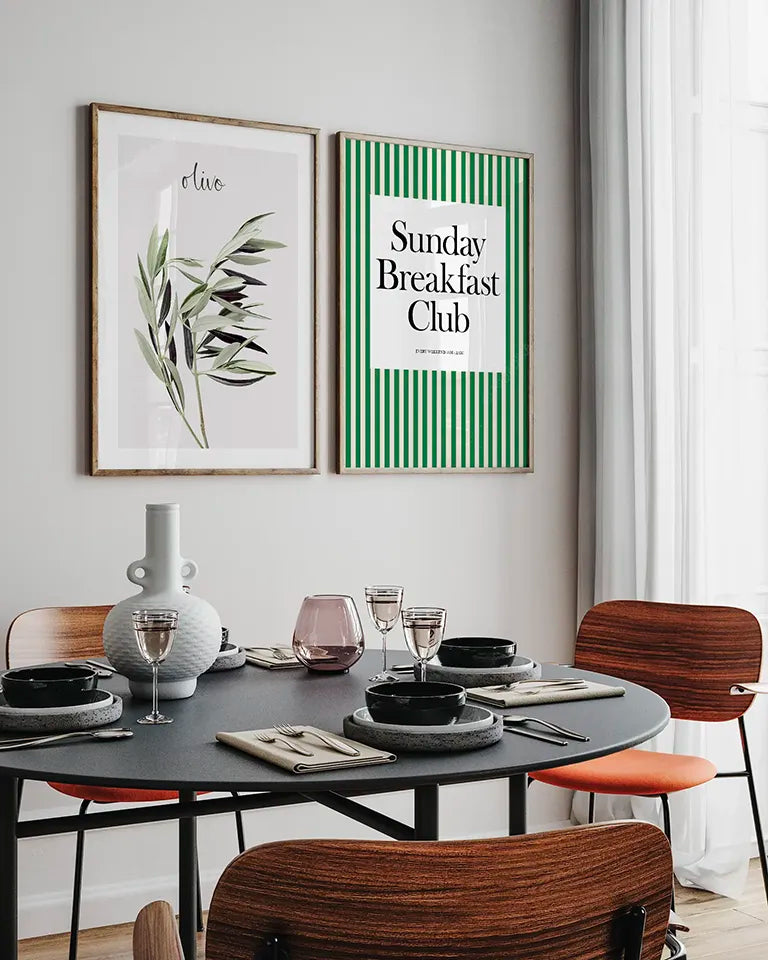 Mutfak ve yemek alanları için tipografik ve illüstratif posterler. Düzenli ve net bir görünüm sağlar.