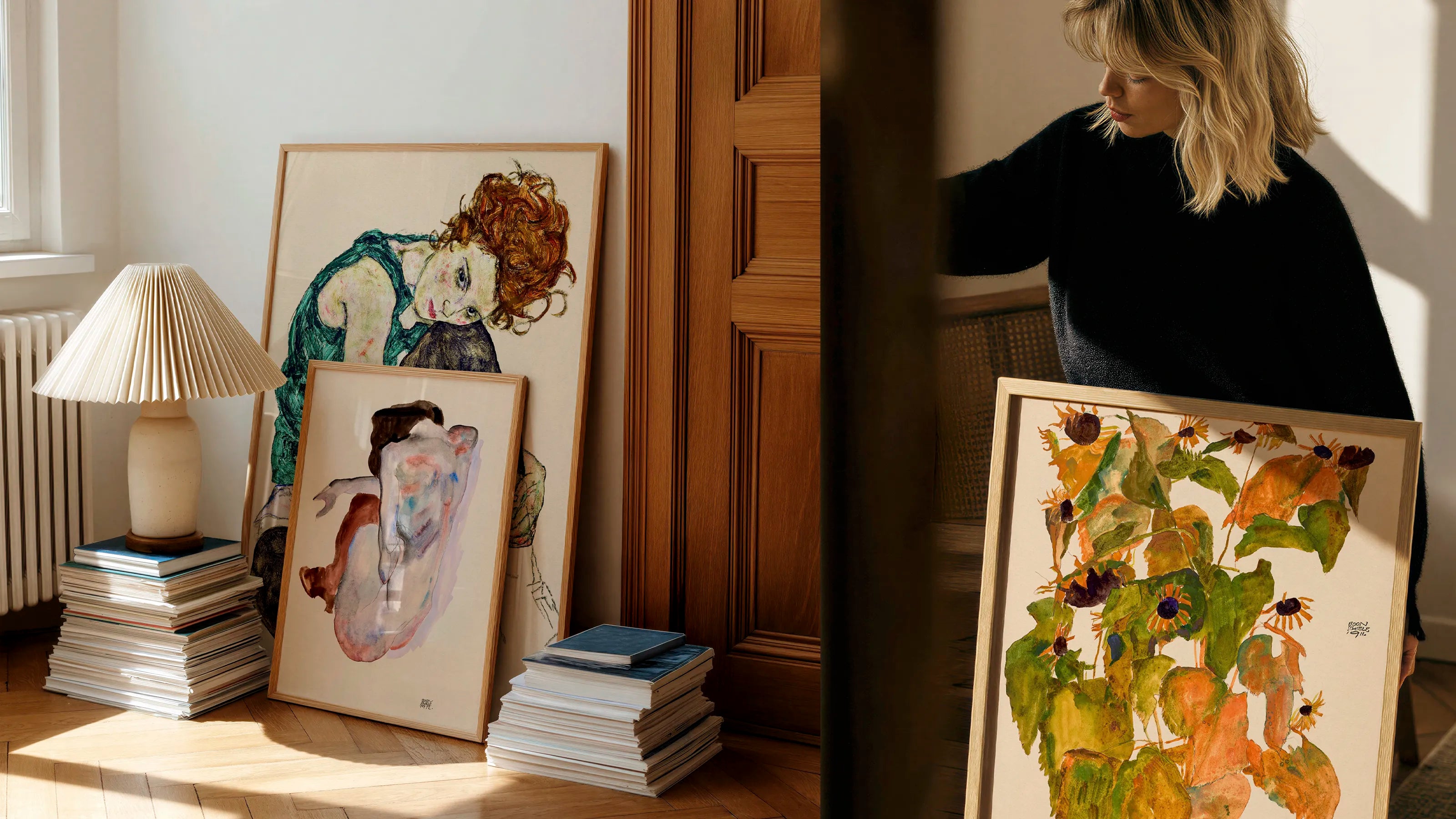 Modern ve klasik sanat arasında dengeli bir duvar düzeni oluşturmak için farklı dönemlerden sanatçıların eserlerinden oluşan seçki.