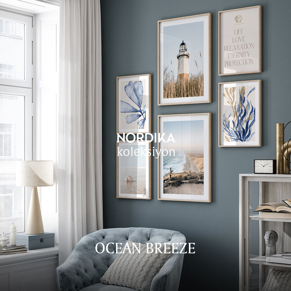 Sahillerin taze ve canlandırıcı özünü yansıtan tasarımlardan oluşan “Ocean Breeze” koleksiyonumuzla kendinizi denizin serinliğine bırakın. Mavi ve bej renk paletinden oluşan ve deniz feneri, sakin dalgalar ve kıyı bitki örtüsü fotoğrafları, bitki formlarının yer aldığı bu seri, her ortama denge ve aydınlık getiriyor. Oturma odaları ve dinlenme alanları için özel olarak tasarlanmış olan “Ocean Breeze”, doğayla yeniden bağ kurmanızı, rahatlamanızı ve okyanus esintisinin evinizin her köşesine ilham vermesine izin vermenizi sağlıyor.ALIŞVERİŞE BAŞLA