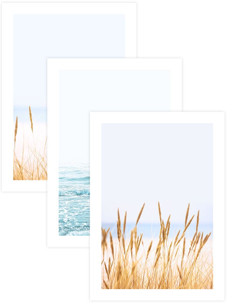 Minimalist buğday ve deniz fotoğraflarından oluşan güzel bir set. Evinize aydınlık bir görünüm vermek için harika bir seçenektir.