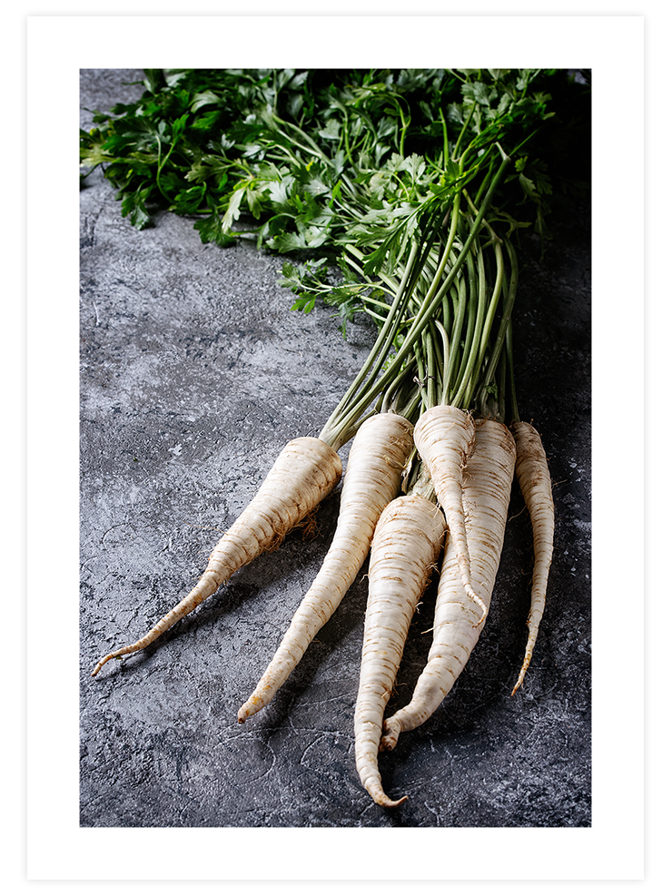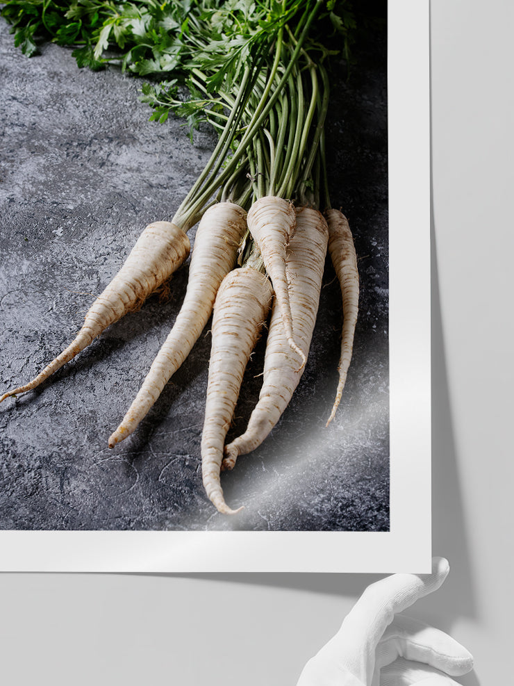Uzun yeşil yapraklı beyaz havuçların görüldüğü güzel bir mutfak posteri. Bu fotoğrafı mutfağınıza yerleştirip şık bir duvar dekorasyonu oluşturabilirsiniz. Ayrıca, farklı posterlerle bir arada kullanıp modern bir görünüm elde edebilirsiniz.