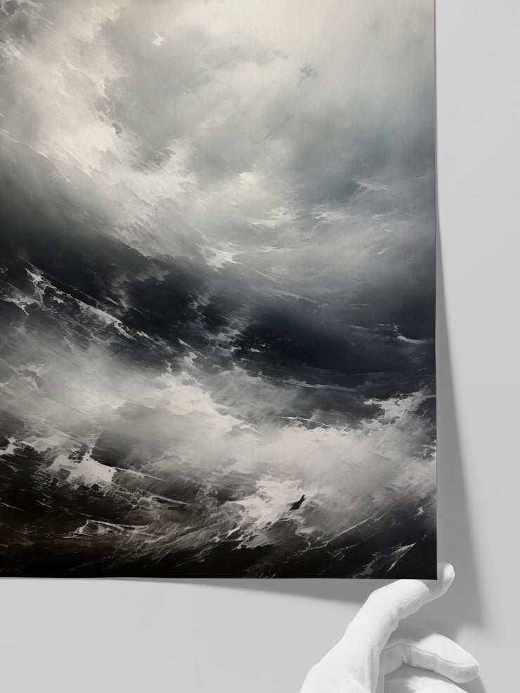 Bulutlu ve fırtınalı bir havanın yansıtıldığı dalgalı deniz posteri. İç mekanına dinamizm katmak isteyenler için idealdir.