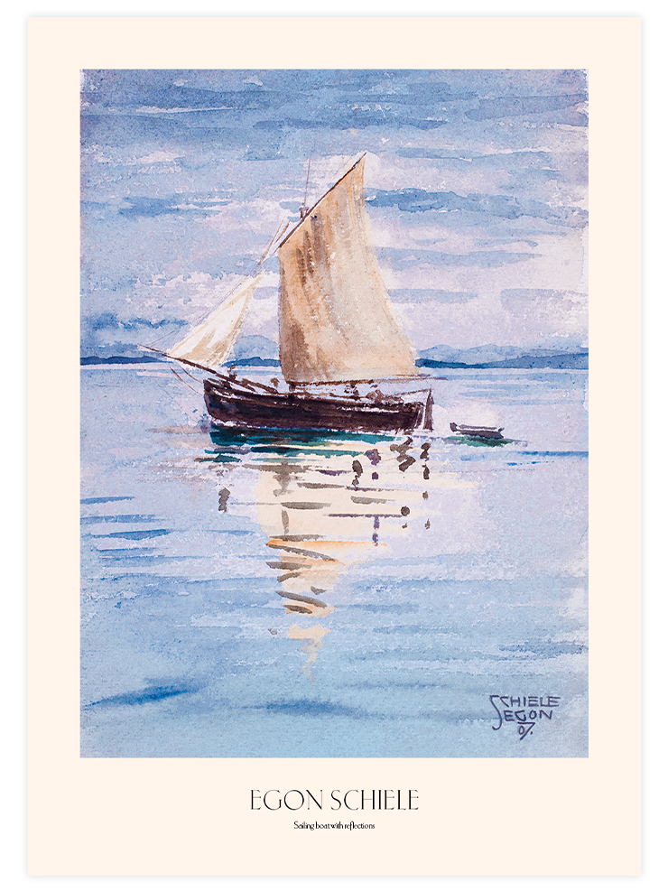 Egon Schiele tarafından yapılan Yelkenli Tekne ve Yansıması adlı resmin posteri. Sanatsever sevdiklerinize hediye edebilir veya kendi iç mekânınızda kullanarak modern bir dekorasyon oluşturabilirsiniz. Posterin alt kısmında ressamın ve eserin adı yer almaktadır. Bu eser, La Collection'un uzman restoratörü tarafından özenle dijital olarak restore edilmiştir. Egon Schiele Koleksiyonunu Gör