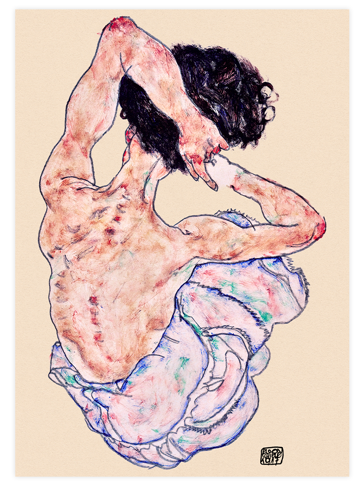 Egon Schiele'nin 1917 yılında yaptığı Sırtı Çıplak Oturan Kadın, Arkadan Görünüm posteri. Ellerini başının arka tarafında kavuşturmuş sırtı çıplak arkası dönük halde oturan bir kadın figürünü barındıran bu güzel tablonun posteri iç mekânlara sanatsal bir dokunuş katmak için güzel bir seçenek olabilir. Bu eser, La Collection'un uzman restoratörü tarafından özenle dijital olarak restore edilmiştir. Egon Schiele Koleksiyonunu Gör