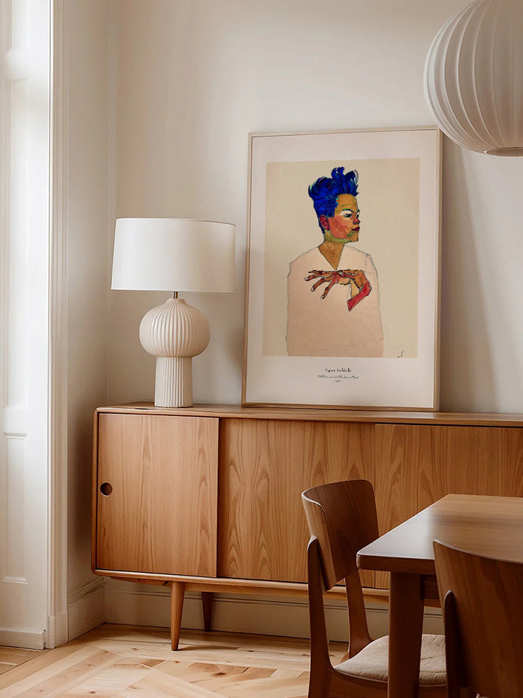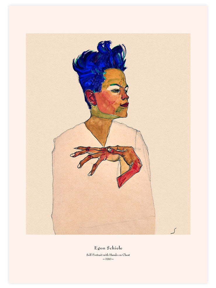 Egon Schiele'nin 1910 yılında yaptığı Eller Göğüste Otoportre adlı tablosunun posteri. Posterin alt kısmında şık bir yazı tipi ile ressamın ve eserin adı ve yılı yer almaktadır. Schiele severlerin beğenisine sunduğumuz bu güzel poster iç mekânlara sanatsal bir dokunuş katmak için harika bir seçenektir. Bu eser, La Collection'un uzman restoratörü tarafından özenle dijital olarak restore edilmiştir. Egon Schiele Koleksiyonunu Gör