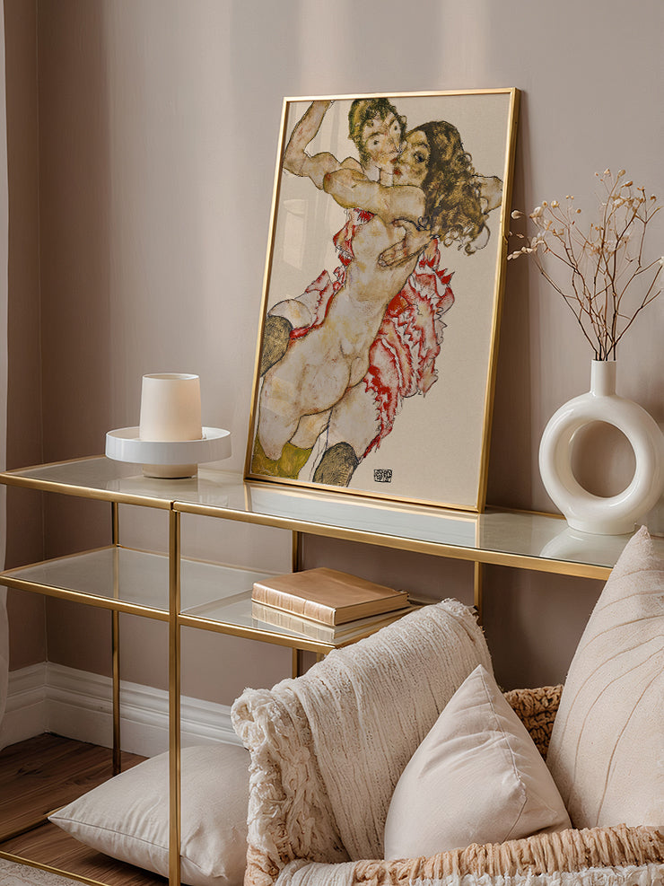 Ressamın 1915 yılında yaptığı Birbirine Sarılmış İki Kadın adlı tablosunun posteri. Schiele, eskiz tadında olan bu çizimi için suluboya ve guaj boya kullanmıştır. Bej tonlarda bir zeminde yer alan Schiele’nin bu güzel çalışması iç mekânlara sanatsal bir dokunuş katmak için güzel bir seçenek olabilir. Bu eser, La Collection'un uzman restoratörü tarafından özenle dijital olarak restore edilmiştir. Egon Schiele Koleksiyonunu Gör