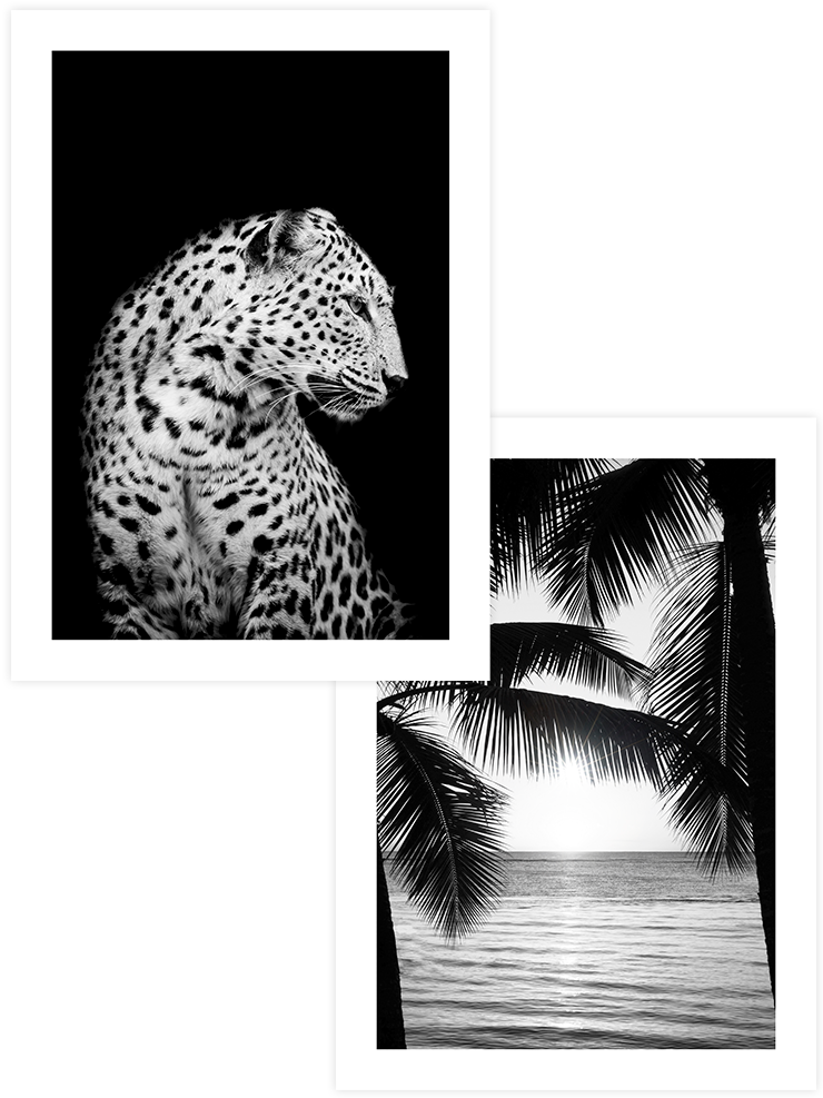Siyah beyaz leopar ve deniz fotoğraflarından oluşan güzel bir ikili poster seti. Yatak odanızda ya da salonunuzda şık bir etki yaratacaktır.