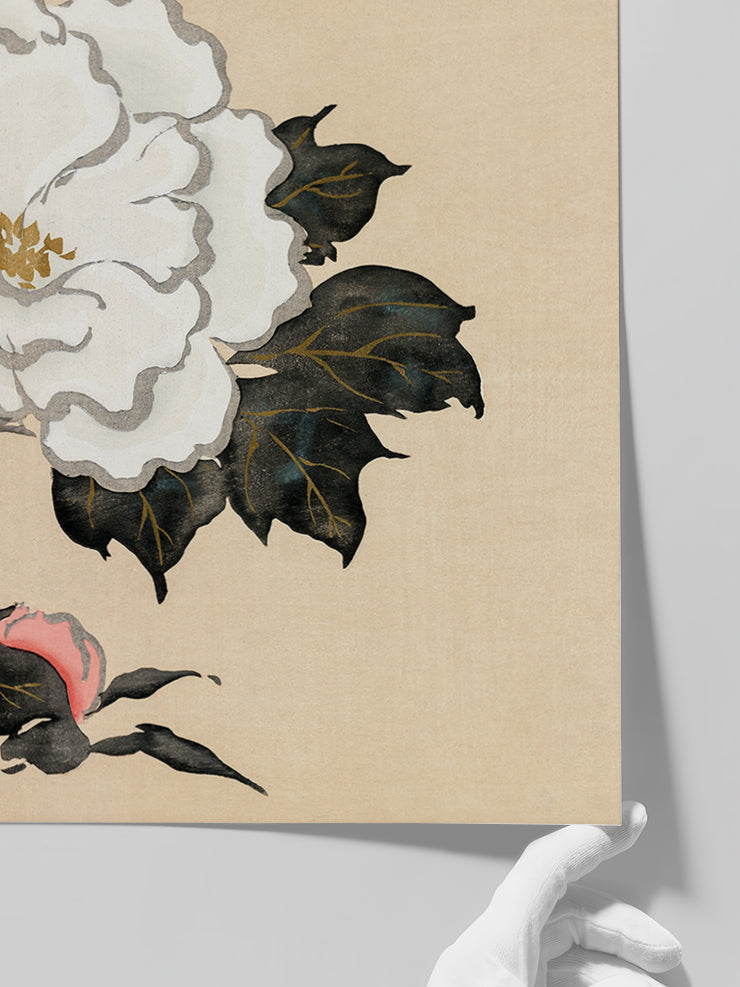 Japon ressam Kamisaka Sekka’nin bej bir fon üzerine çizdiği yeşil yapraklı beyaz ve pembe çiçek tablosunun posteri. Bu güzel eser, nötr tonları sayesinde her türlü dekorasyona uyum sağlar. Özellikle salon için idealdir. Bu eser, atölyemizdeki uzman bir restoratör tarafından özenle dijital olarak restore edilmiştir. Japan Art Koleksiyonunu Gör