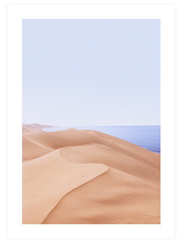 Arka planda mavi gökyüzünün mavi deniz ile birleştiği bir manzara ön planda ise bej tonlarda kum tepelerinin yer aldığı güzel bir fotoğraf.