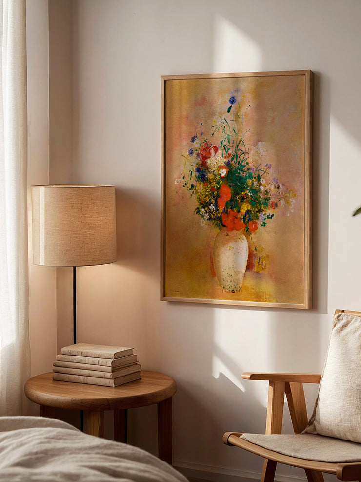 Sembolist Fransız ressam Odilon Redon’un Çiçek Vazosu tablosunun posteri. Resme dikkatli bakıldığında detaylı çalışılmış gelincik çiçeği, mavikantaron, çayır papatyası gibi çiçekler görülebilir. Arka planda ise sarı tonlarda daha silik bir şekilde mücevher benzeri bir obje yer almaktadır. Bu eser, atölyemizdeki uzman bir restoratör tarafından özenle dijital olarak restore edilmiştir. Odilon Redon Koleksiyonunu Gör