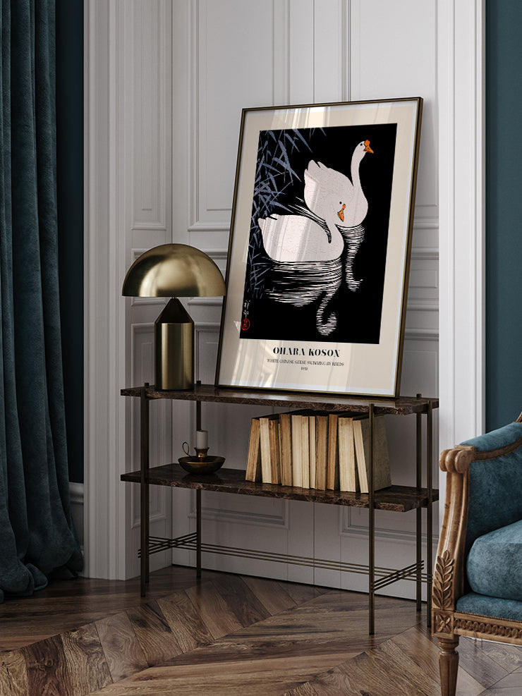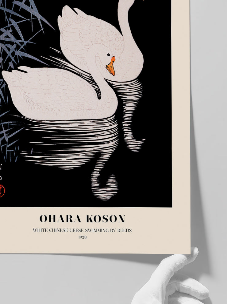 Ohara Koson’un Beyaz Çin Kazı adlı çalışmasının posteri. Bu eserin orijinali ahşap baskı tekniği ile yapılmıştır. Siyah arka plan, açık renkli tüylü kazlar ile güzel bir kontrast oluşturmuştur. Kuşların çizgi çizgi oluşturulan sudaki yansımaları resme ayrı bir güzellik katmıştır. Yaşam alanlarınıza sanatsal bir dokunuş getirmek için harikulade bir eserdir. Posterin alt bölümünde bej bir zeminde ressamın adı ve eserin İngilizce adı ve yılı yer almaktadır. Bu eser, atölyemizdeki uzman bir restoratör tarafından özenle dijital olarak restore edilmiştir. Japan Art Koleksiyonunu Gör