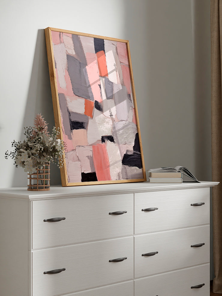 Pembe tonların ön planda olduğu soyut bir poster tasarımı. Evinize pembe bir dokunuş katmak için tercih edebilirsiniz. Karma teknik ile oluşturulmuş dijital resim.