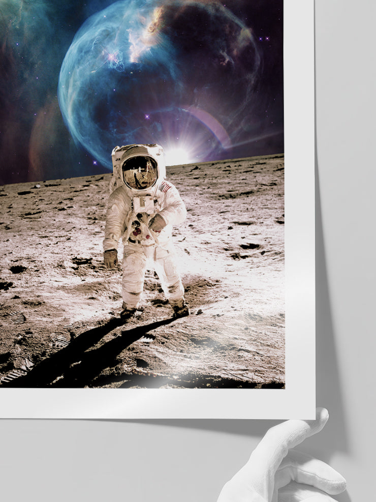 Ay’ın üzerinde duran bir astronotun yer aldığı çok güzel bir astronot posteri. Uzaya, astronotlara, astronomiye meraklı herkese hitap edebilecek güzel bir tasarım. Ayrıca genç odası veya çocuk odası için hediye arıyorsanız bu uzay tablo posteri iyi bir fikir olabilir. Exclusive Poster. Bu poster atölyemizin bir tasarımcısı tarafından yaratılmıştır.