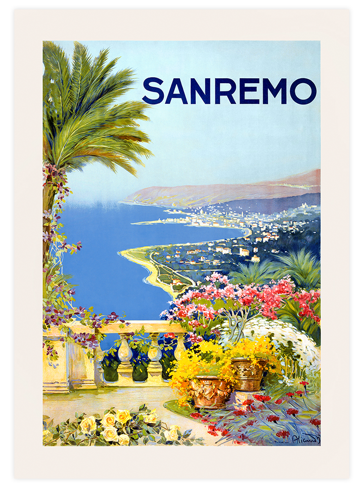 İtalya’nın güzel sahil kasabası Sanremo'nun rengarenk çiçeklerle bezenmiş bir balkondan görülen pitoresk bir manzarasının yer aldığı şık vintage poster. Resmin üst kısmında büyük harflerle "SANREMO" yazmaktadır. Sol tarafta açık mavi gökyüzüne doğru yükselen bir palmiye ağacı bulunmaktadır. Bu vintage poster, evinize veya ofisinize retro bir görünüm katmak için harika bir seçenektir. Vintage Koleksiyonunu Gör